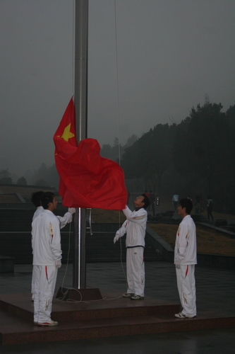 6点50分,只见四名护旗手身着洁白的服装,精神抖擞地护卫鲜红的国旗来到旗杆前。7点整,升旗仪式正式开始,伴着徐徐上升的五星红旗,参加仪式的校优良学风示范班机械学院机制056班全体同学响亮地唱起了国歌,正准备到教室晨读的同学们纷纷加入到队列中,爱国爱校的情怀在此刻得到升华。参加仪式的史方敏同学说:“我们将以饱满的热情,昂扬的斗志迎接教育部对我校的本科教学工作水平评估,为学校添彩,为国旗增光!”
