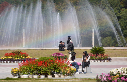 阳光明媚,空气新鲜,今天虽然周六,但一早的校园还是人气很旺。有同学在散步,有同学在晨读,有同学在锻炼。和山广场的喷泉旁更是热闹,一整个班的同学在喷泉映衬下合影留念。