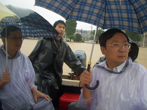 9时50分,经多方联系,校领导商议决定由校党委书记徐志平、校长杜卫、校党委副书记陈浩设法进入小和山校区,坐镇抗台一线指挥,副校长吕进留守学院路校区负责物资调运。