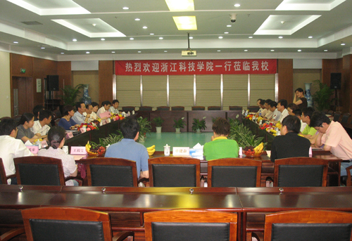 图2 浙江万里学院党委副书记蒋建军(左一)向我校考察团成员介绍情况
