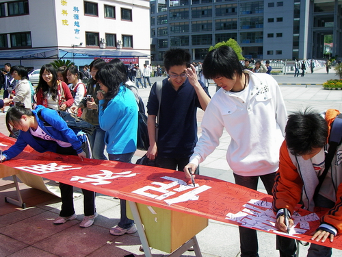 4月18日,生化学院准工程师协会发起组织“迎评促建签名活动”。蜂拥而来同学们在条幅上庄严地签上自己的姓名。校党委副书记陈浩和许多老师们也赶来参加活动。