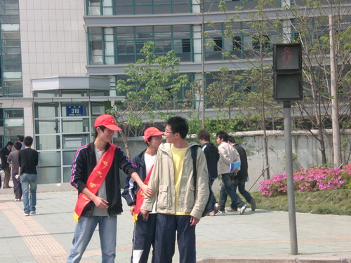 在斑马线前,他们一面耐心地协助引导交通、劝导违规行走的同学,一面宣传交通安全常识,希望用自己的绵薄之力提醒全校同学树立大学生的文明新形象。