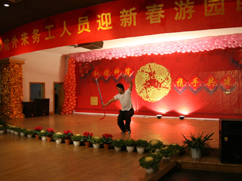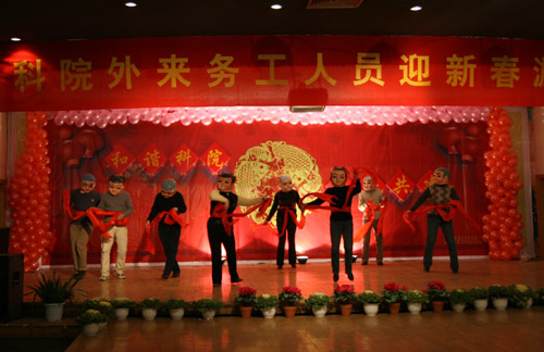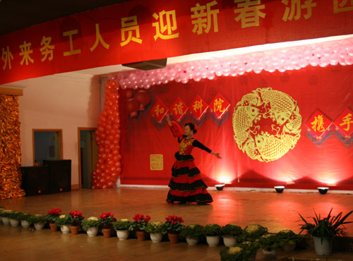 联欢会上,外来务工人员表演了自编自演的文艺节目,有独唱、对唱、戏曲、诗朗诵,还有武术、绝技、舞蹈、小品等。校领导也和外来务工人员同台演出。掌声和欢呼声接连不断,会场气氛非常热烈。由全校分工会主席表演的大头娃娃舞—《快乐老家》,更是把联欢会推向了高潮。