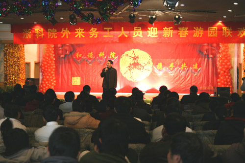 陈根芳在联欢会上致辞。他充分肯定了外来务工人员在推进学校建设、促进学校发展中起到的积极作用,并代表学校对外来务工人员表示诚挚的慰问和衷心的感谢。他说,外来务工人员是我们的兄弟姐妹,你们勤劳苦干、默默无闻、任劳任怨,为学校的快速发展作出了贡献。2007年,学校面临着新的机遇和挑战,希望大家继续团结一心,努力工作,为学校的建设和发展多出力,为顺利通过教育部的本科教学评估作出新贡献。
