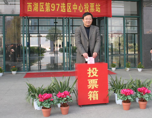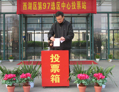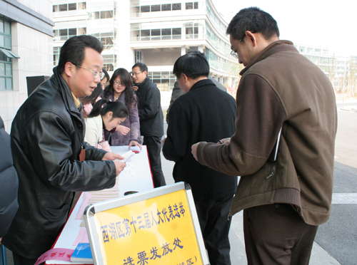 下午2点,设在我校小和山校区的西湖区第97选区中心投票站举行了简短的投票仪式。我校党政领导徐志平、杜卫、胡浙平、陈浩、龚建立、陈根芳、吕进、鲁凤出席了仪式。校选举工作领导小组组长陈浩主持仪式。工作人员宣布了正式代表候选人名单,检查了票箱并加贴封条。随后,列队等候的校机关100多名选民依次持选民证领取选票,并将填写的选票放入了红色的投票箱。据统计,我校选民投票率达到91%以上。