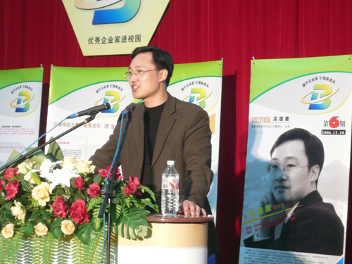 12月10日晚6:30,我校在小和山校区A4-122报告厅举办 “握手企业家、引领新成长” 第6期优秀企业家进校园活动。德意控股集团有限公司董事长、总裁高德康与我校师生进行了一场精彩的面对面交流。校党委副书记陈浩主持报告会,校团委、建工学院、生化学院等部门负责人、部分辅导员和大学生KAB俱乐部、大学生创业者协会同学等600多人参加了此次企业家进校园活动。