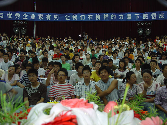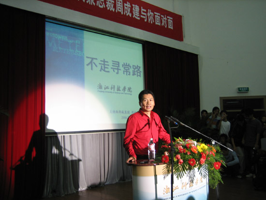 “其实,在我创业的过程中,也曾遇到过比服装业更有诱惑的行业,但我始终记得老师的一句话‘只要功夫深,铁棒磨成针’,所以才走到了今天。”周成建结合自己从一位普通农村小伙子成长为一位优秀企业家的艰苦历程及心得体会同大学生们进行了面对面的交流。他说,每个人都有不同方式的成功,有的同学以成绩好为成功,有的同学以体育好为成功,还有些同学认为交际广泛、人缘好就是成功。正因为如此,我们更要端正自己对待成功的心态。对自己要有充分的自信,做事情要充满激情,学知识要不断地更新、延续。只有这样才能享受持续性的成功感觉。