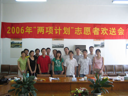 6月22日上午,我校在学院路校区学校会议室举行了简朴又隆重的2006年“两项计划”( 大学生服务西部计划和省内欠发达地区计划)志愿者欢送会。校党委副书记陈浩出席欢送会并讲话。