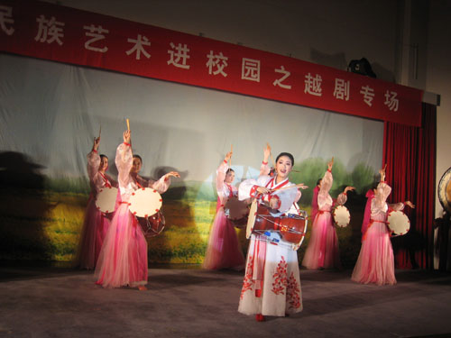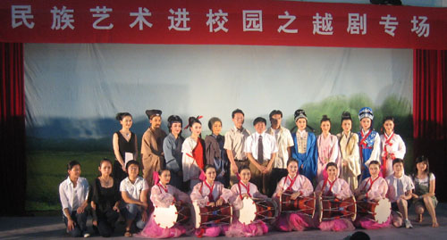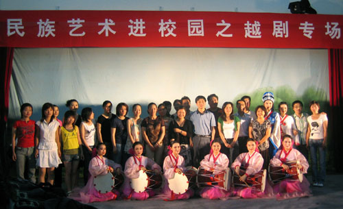 越剧团在我校连续表演了两场,内容既有经典剧目《梁祝•十八相送》,古典名著改编剧目《西厢记•传简》、《窦娥冤•斩娥》、《赵氏孤儿•夺子》,又有现代名著改编剧目《祥林嫂•抬头问苍天》和朝鲜名典名著改编的《春香传•端阳歌》。同学们热情高涨,与剧中人物同喜同悲,被演员们的俊美扮相、柔美唱腔和传神演绎深深感染,场内不时响起了阵阵的掌声。演出结束后,学校领导上台和演员们亲切握手和问候,浙江小百花越剧团特意赠送了他们演出的纪念光盘。