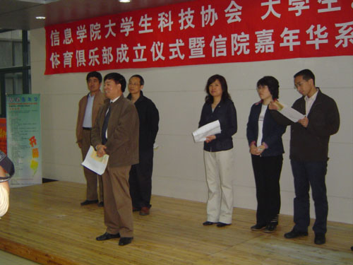 校党委副书记胡浙平老师在开幕式上讲话,他代表学校向信息学院大学生科技协会、大学生艺术团、大学生体育俱乐部成立仪式和“信院嘉年华”系列活动的开幕表示热烈祝贺。他说,21世纪是一个充满竞争和挑战的世纪,大学生要不断地追求进步、勇于实践,要不断地融入社会,更快更好地培养提高自己。信息学院3个社团的成立对推进校园文化建设及社会主义荣辱观教育将起到积极的作用。