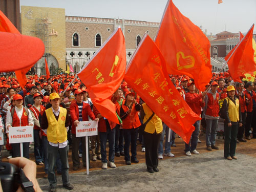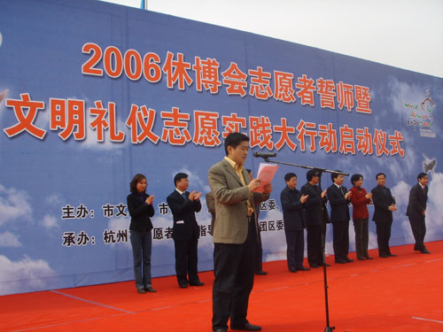 4月15日,我校生化学院青年志愿者与兄弟院校青年志愿者一起前往杭州休博园圣马可广场,参加了2006世界休闲博览会志愿者誓师大会暨文明礼仪志愿实践大行动启动仪式。会上,我校志愿者与所有志愿者一起宣誓:用我们的一言一行、一点一滴,描绘一幅人间天堂的文明图景。