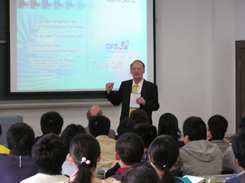 2006年4月1日 —9日,德国汉诺威应用科学大学、不伦瑞克/沃芬比特尔应用科学大学、纽伦堡应用科学大学、肯普滕应用科学大学、奥登堡/东弗里斯兰/威廉港应用科学大学分别派教授来我校机械学院、电气学院、信息学院、生化学院进行中德联合培养本科生项目的专业选拔工作,专业选拔分笔试和面试。我校65名学生参加了选拔考试,59名学生顺利通过了专业选拔,通过率为88%。德国教授对于我校的教学质量及为此付出的努力给予了高度的评价。