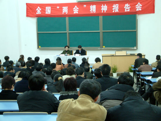 3月25日,我校小和山校区600多人的学术报告厅座无虚席,第十届全国人大代表沈莲清院长在这里向学校教职工和学生代表传达全国人大十届二次会议精神。党委书记金光远主持了报告会。