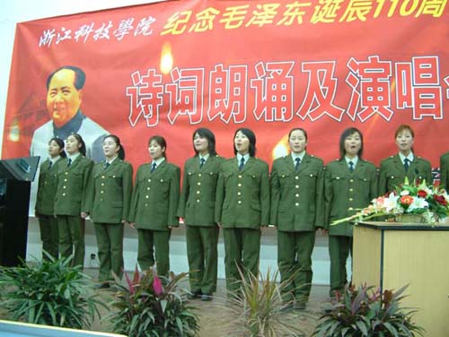 为缅怀毛泽东同志的丰功伟绩,纪念毛泽东诞辰110周年, 12月25日晚,浙江科技学院在小和山校区隆重举行纪念毛泽东诞辰110周年诗词朗诵及演唱会。浙江科技学院党委书记、副院长金光远参加晚会并致辞。晚会由院党委宣传部、学工部,院工会、团委主办,学校党政领导、各系总支书记、辅导员和学生600余人观看了演出。